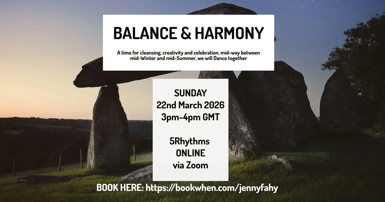 My work is offered through one-on-one private sessions, online 5Rhythms classes, community movement events, residential retreats in Ireland and through my membership circle, The Emerald Rhythm Circle
